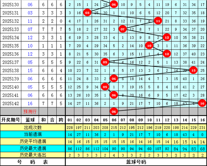 遗漏分析:最近7期红球遗漏总值分别为:19、29、11、53、38、6、30,开出5个遗漏值9以上的冷码红球,目前红球遗漏值9以上的冷码红球有4个:06、07、16、21,本期不看好这几个冷码,预计继续轮空。