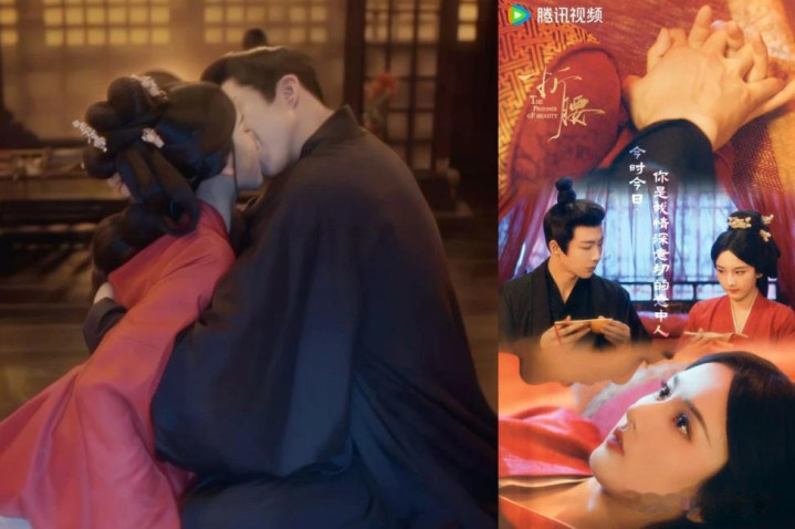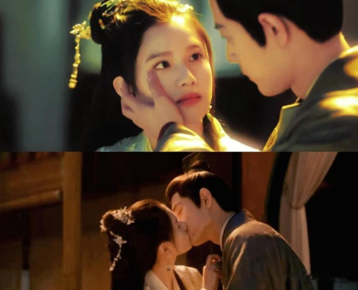 《折腰》剧情前期,先婚后爱的小乔、魏劭几乎都在试探碰撞,后小乔心动开撩魏劭,可惜魏劭是个大木头直男,完全不解风情,两人感情戏在后段才甜度飙升,令人印象深刻的吻戏包括魏劭喝醉后,终于难掩爱意主动吻了小乔的额头,以及最后两人的2场圆房。