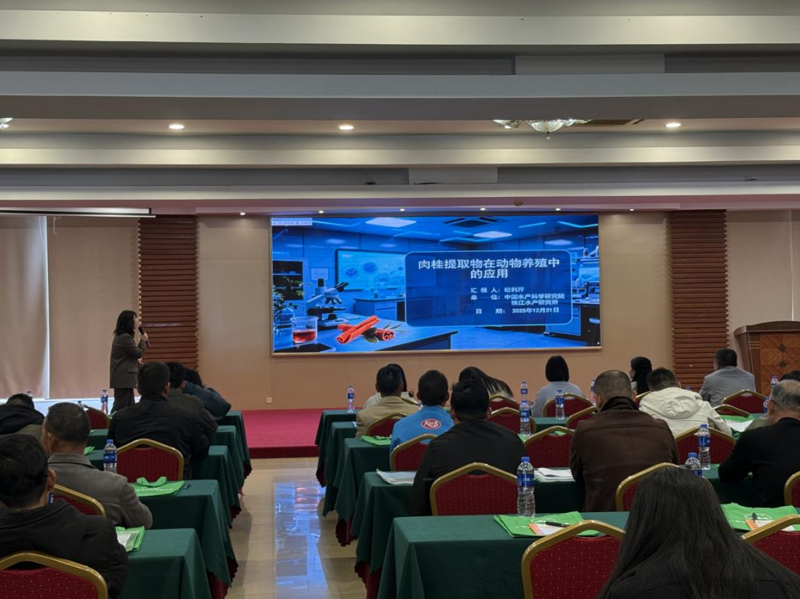 为进一步破解水产养殖技术瓶颈,推动绿色技术落地生根,2025年12月31日,肇庆市高要区农业农村局联合高要区水产技术推广中心、珠江水产研究所共同举办2025年现代水产养殖技术培训班。培训聚焦鱼虾类病害防治、质量安全法规等核心需求,特别将肉桂提取物在罗氏沼虾养殖中的创新应用作为重点授课内容。珠江水产研究所助理研究员纪利芹博士结合最新研究成果与实际案例,详细解读了肉桂提取物的应用价值:不仅具备诱食特性,能提高罗氏沼虾摄食率与生长速度、优化肌肉蛋白含量,为“高桂虾”品牌化发展筑牢基础;还能改善应激导致的组织损伤,增强罗氏沼虾抗感染能力,完全契合国家绿色渔业发展政策导向。