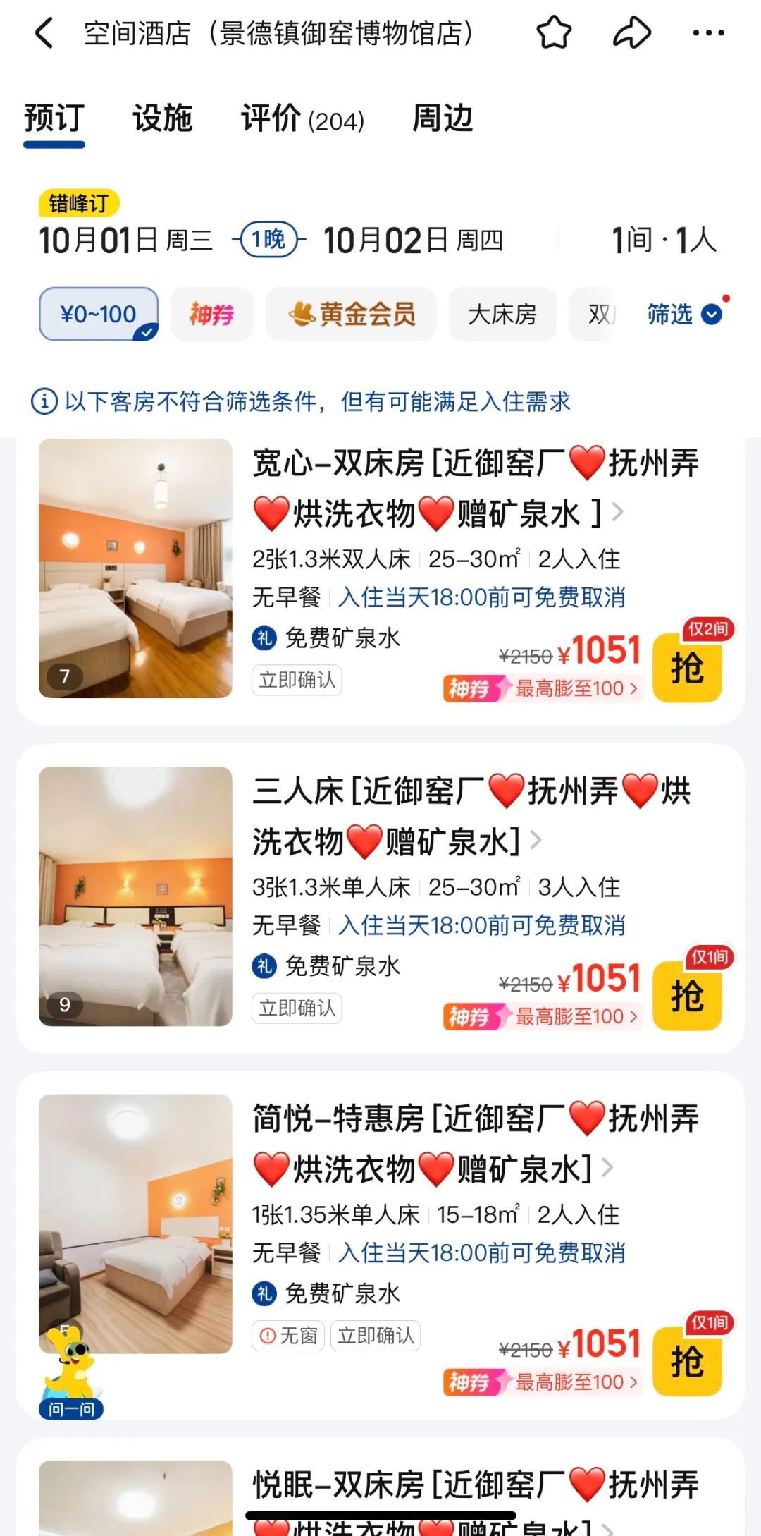 此前,据经视直播报道,近日,有网友发帖称,江西景德镇空间酒店(御窑博物馆店)国庆期间一间房价格高达约1000元,而9月份同房型价格仅为90元左右,涨幅超过十倍,该网友直呼“太离谱了”。
