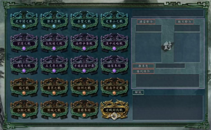 《三国志11》的决战称霸模式每一关都有独特的玩法设计和策略深度,前两关作为一星难度的入门关卡,主要是让玩家熟悉游戏的单挑机制、兵器使用和地形利用,为后续高难度关卡打下基础。后续关卡的难度会逐渐提升,不仅需要合理搭配武将、兵种,还需要制定更为详细的战略布局,可玩性极高。